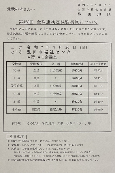 7月20日(日)検定試験詳細です。
