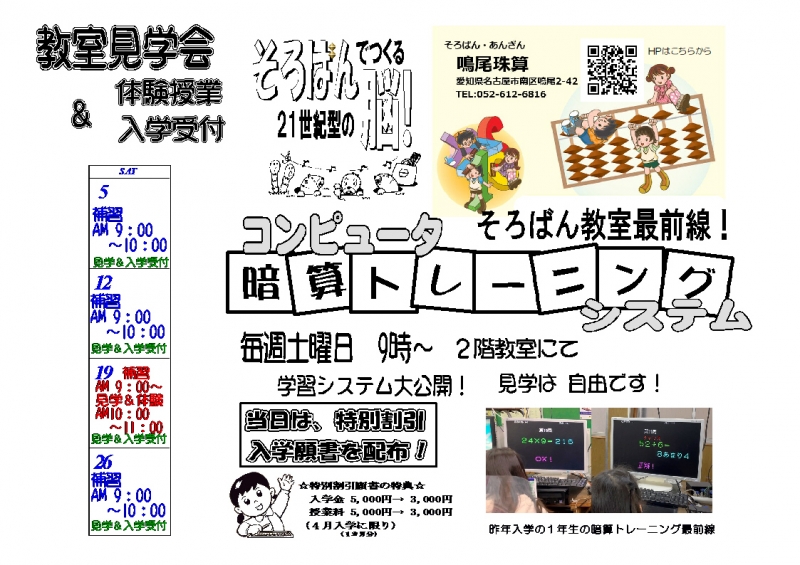 新入生に限らず、在塾生でお子さんがどの程度の暗算能力がついたのかを見学することも出来ますので、ご遠慮なくお越しください。