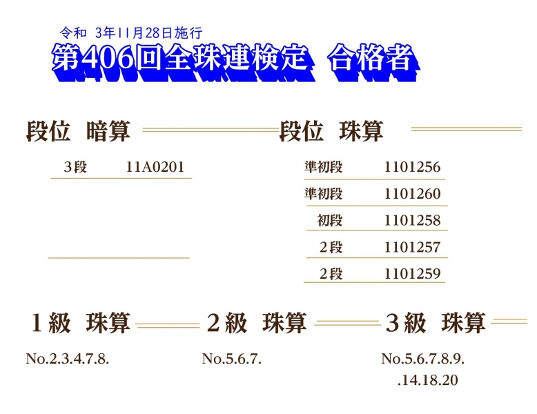 第406回全珠連検定試験合格者(3級以上)