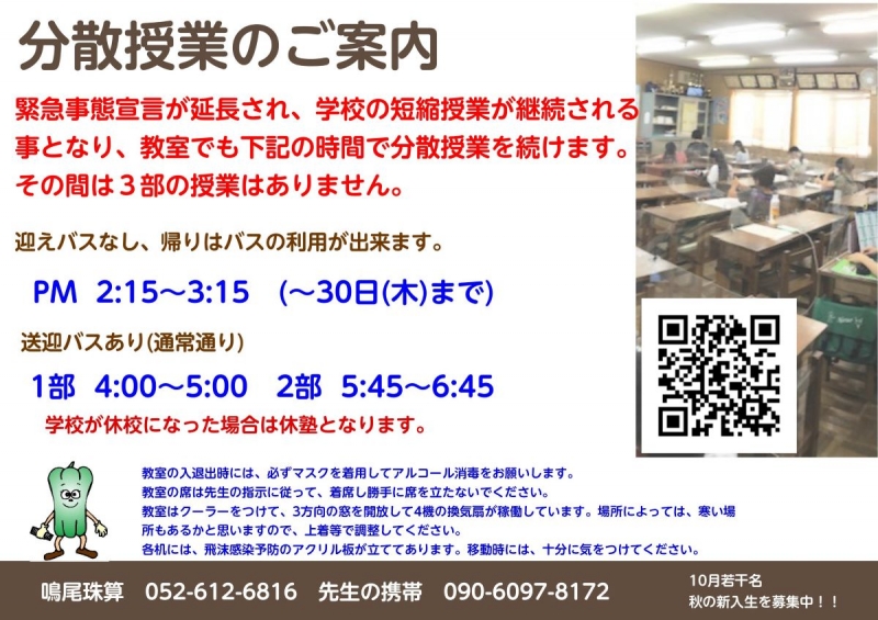 緊急事態宣言の9月末までの延長が決まり、学校の短縮授業となりましたので、教室の分散授業を継続しますのでよろしくお願いします。