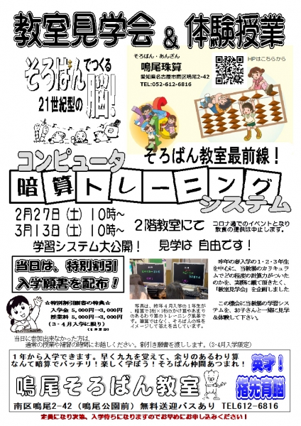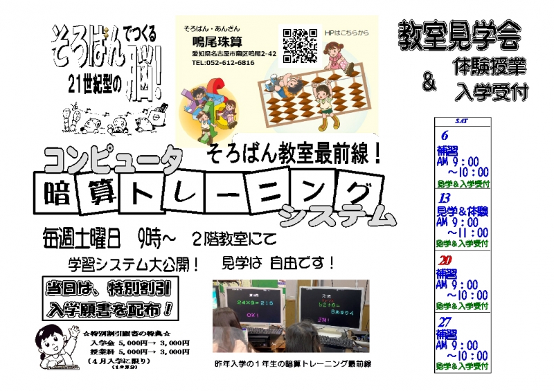 13日の教室見学会&体験&受付を予定していますが、3密を避ける為に毎週の土曜日午前9時~10時の間でも可能です。新学期は4月5日(月)がスタートになります。