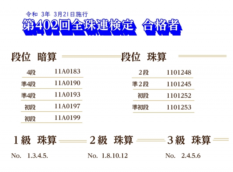 第402回全珠連検定試験合格者(3級以上)