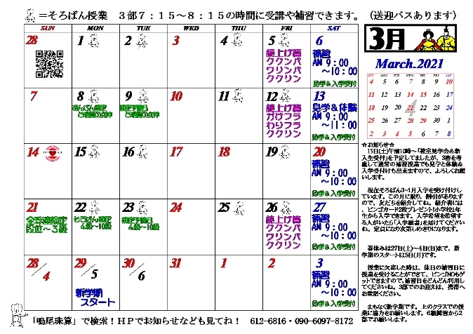 3月カレンダーを掲載しました。