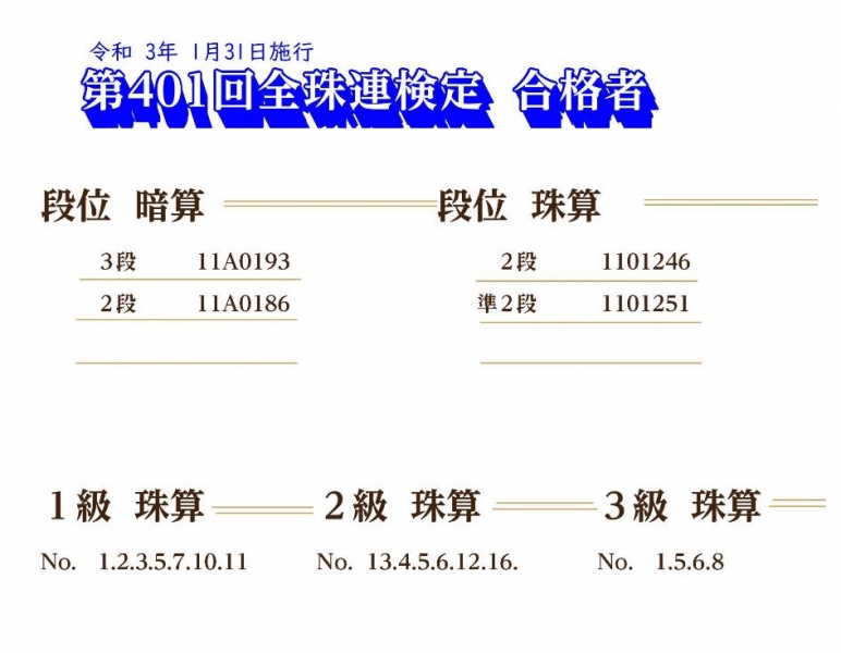 第401回全珠連検定試験合格者(3級以上)