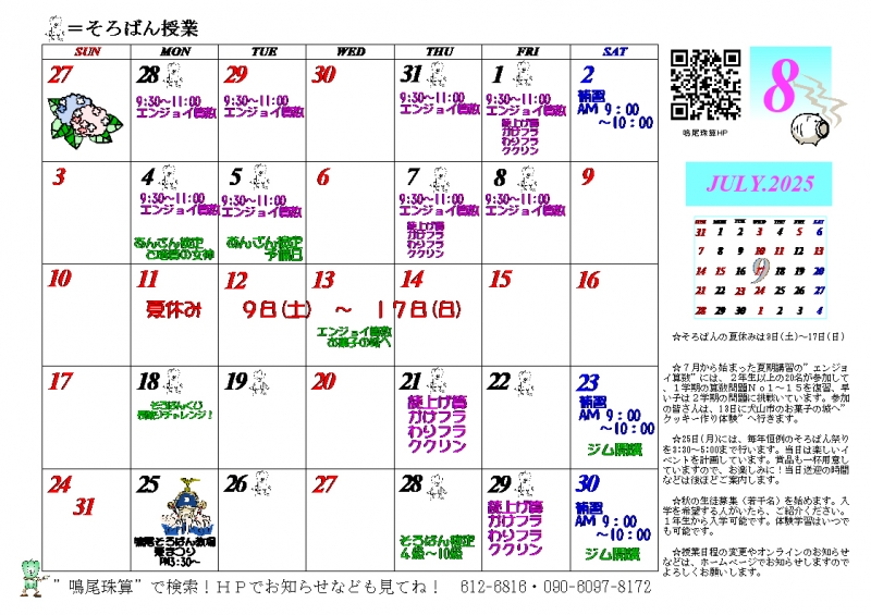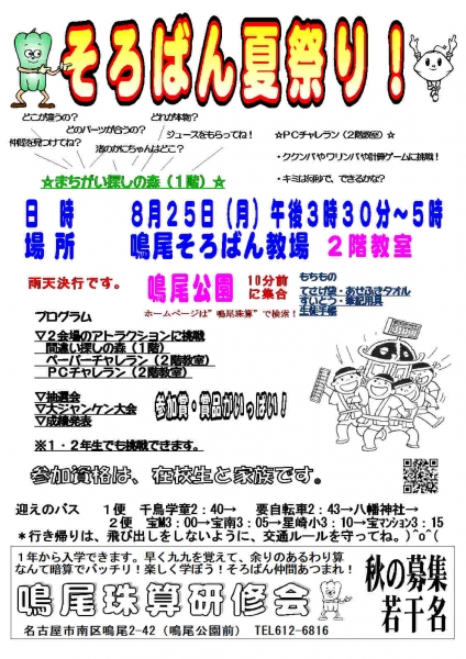25日(月)には、そろばん祭りを予定しています。楽しい企画で賞品も一杯用意していますので、お楽しみに!