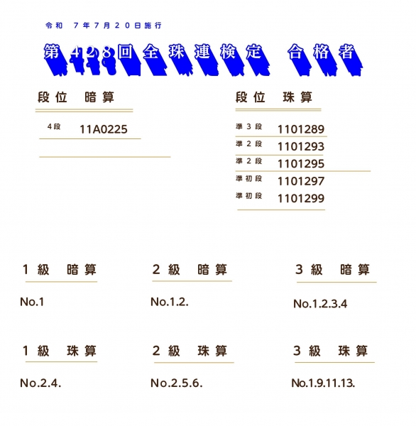 第428回全珠連検定合格者発表(段位~3級)