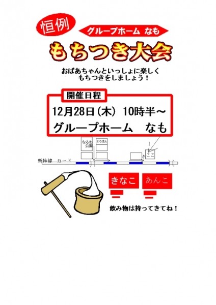 毎年恒例、餅つき大会を介護施設"グループホームなも"さんと一緒に行います。皆さん、餅つきを体験して美味しいつきたてのお餅を食べましょう!