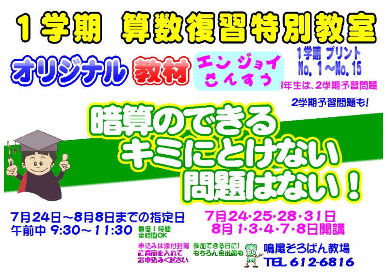 7月24日~8月8日までの指定した9日間、午前9時半~11時半(1時間でもOK!)エンジョイ算数・夏期講習があります。