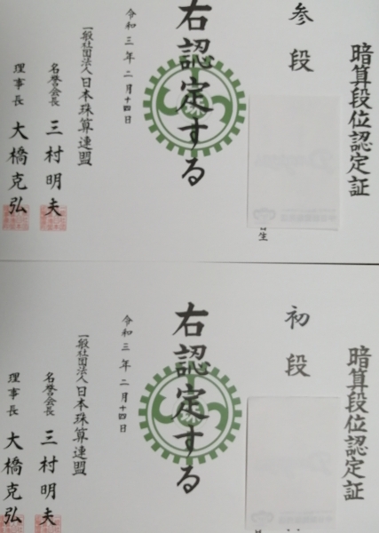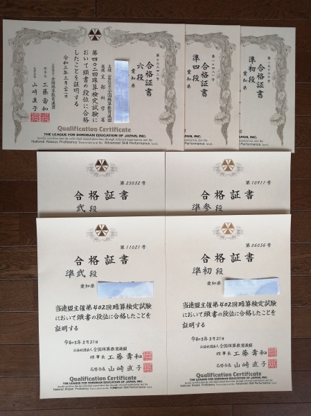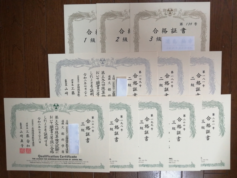◇1級珠算合格の人は7月3級合格、9月2級合格、11月1級合格と最短で合格しました。毎日そろばんの練習をして、きちんと直しをしていました。努力は裏切りません。