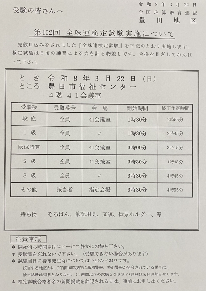 第432回 全国珠算連盟検定試験